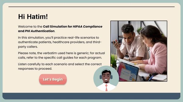 Following the release of the HIPAA Compliance and PHI Overview training, employees at EVERSANA needed a hands-on learning experience to apply the concepts in real-time scenarios. A practical understanding of PHI authentication during calls was still a gap, especially under pressure.