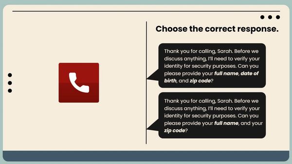 I was tasked with designing an application-style training simulation that mimicked real-life call scenarios, enabling learners to demonstrate how they would respond when authenticating PHI during patient interactions.