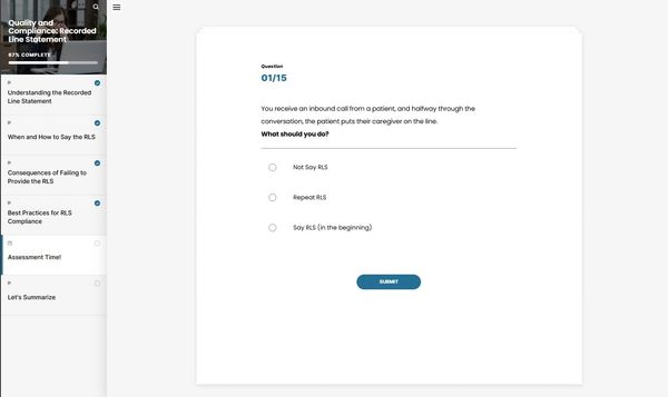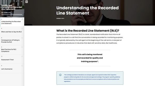 I designed and developed the course using Rise 360, structuring it into easy-to-digest sections that explained the purpose and legal requirement of RLS. The course included clear dos and don’ts, voice tone guidance, and scenario-based quizzes to test agents' ability to identify when to speak the RLS and when it may not be required. I ensured the tone remained practical, relatable, and rooted in day-to-day call behavior.